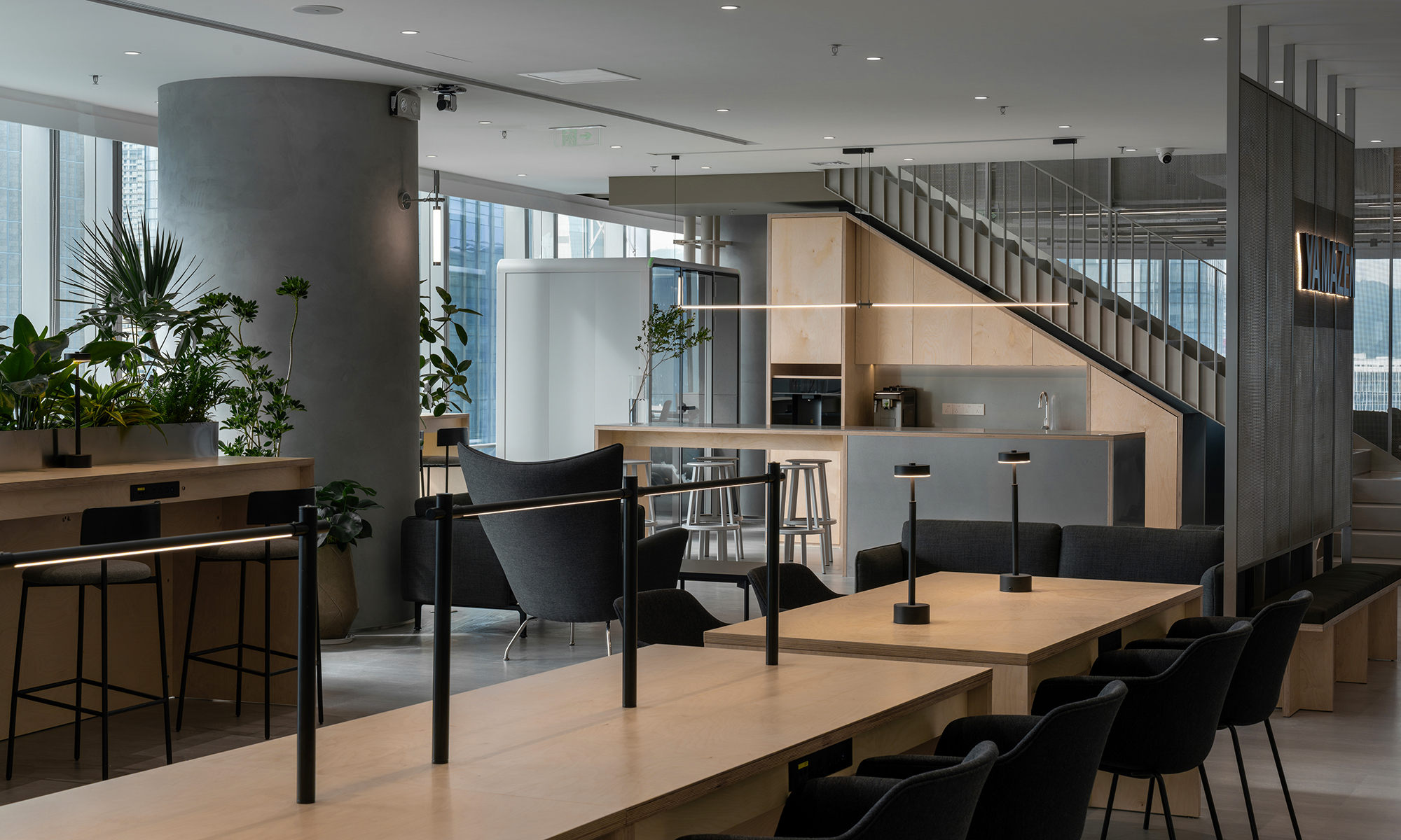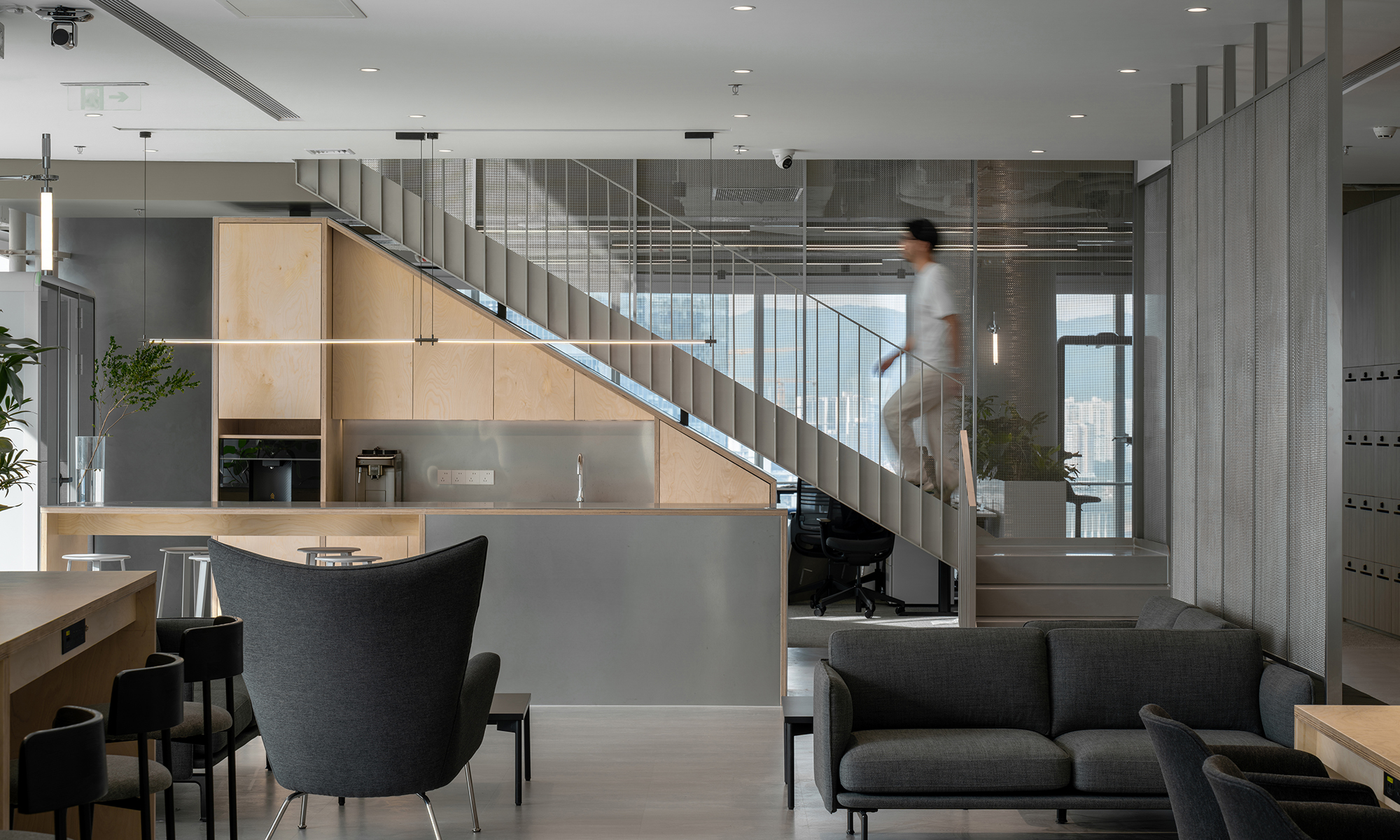 The client recognized a challenge in their existing office: its spatial configuration tended to make employees retreat to their desks, limiting casual encounters and collaboration. This project aims to shift that dynamic by addressing the issue not as a matter of behavior, but of environmental design — creating a workplace where interaction occurs naturally throughout the day.A double-height, open lounge at the entrance serves as the heart of the office. Nearly half of all workstations are assigned as free-address seating, dispersed across various settings — counters, lounges, and focused booths — allowing people to choose where and how they work. This space is more than a work area: it encourages mental refreshment and spontaneous conversation, where everyday exchanges can evolve into ideas. Above, meeting rooms and a casual bar area introduce a vertical axis of communication.The overall layout minimizes walls, adopting an open plan that gently connects different departments. This approach enhances spatial efficiency and provides future flexibility, while a non-linear arrangement of fixed desks preserves order without enforcing uniformity — subtly distancing the workplace from a conventional, rigid office model.Unnecessary decoration is eliminated in favor of carefully selected materials and strategic greenery, which softens boundaries and improves visual comfort.