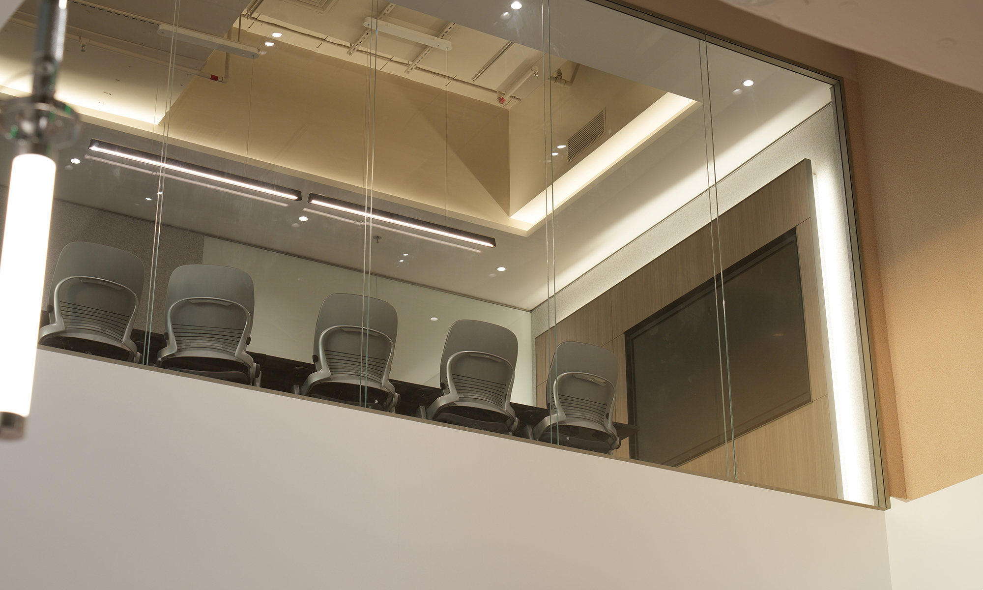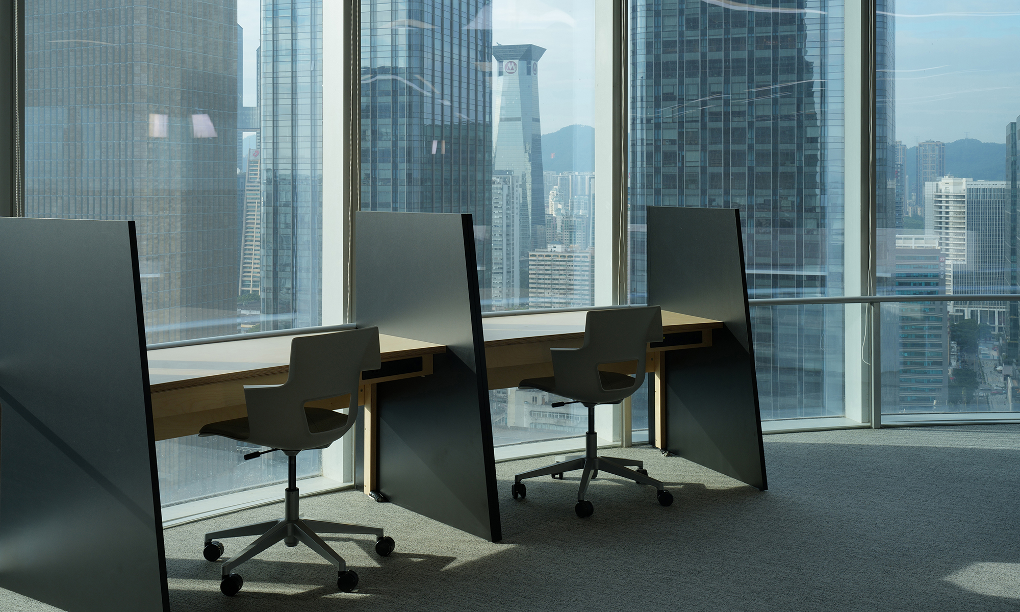 成長を続ける深圳。この都市は、投資・テクノロジー・金融のハブとして、洗練されたオフィス環境が求められています。本プロジェクトでは、都市のダイナミズムを取り込みながら、機能性と美意識を兼ね備えたスタッフカフェテリアを設計しました。ブラック塗装したスケルトン仕上げの天井に、幾何学的なライン照明を配置。都市のリズムを空間に落とし込み、企業の革新性とスピード感を表現しました。壁面と床の大部分にはテラゾーを採用し、光の反射を活かしながら耐久性を確保。ウッドパネルを壁面に配し、素材のコントラストで空間に奥行きを与えました。主要な家具を白で統一しながらも 、ブルーのアクセントカラーをポイントに加え、深圳の空の色と企業の安定感を象徴しています。カフェテリアは食事の場であると同時に、短時間の作業やコミュニケーションを促す場でもあります。オープンなテーブル席、カウンター席、ハイテーブルを組み合わせ、用途に応じたゾーニングを実施。照明は、全体の明度を確保しつつ、エリアごとに変化をつけ、シーンに応じた快適な環境を提供する。無駄を削ぎ落としながらも、都市と調和する洗練されたカフェテリアを目指しました。
